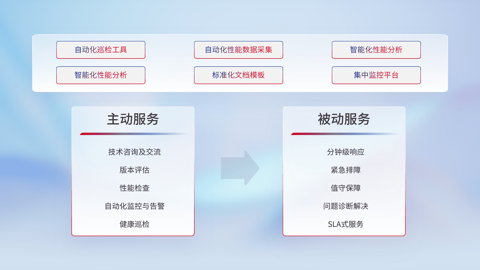 智能化工具和标准化文档,,,保障服务质量,,提供主动服务(包含技术咨询、、、版本评估、、性能检查、、、自动化监控与告警、、健康巡检)和被动服务包含(分钟级响应、、、、紧急排障、、、值守保障、、、问题诊断解决、、、SLA服务)。。